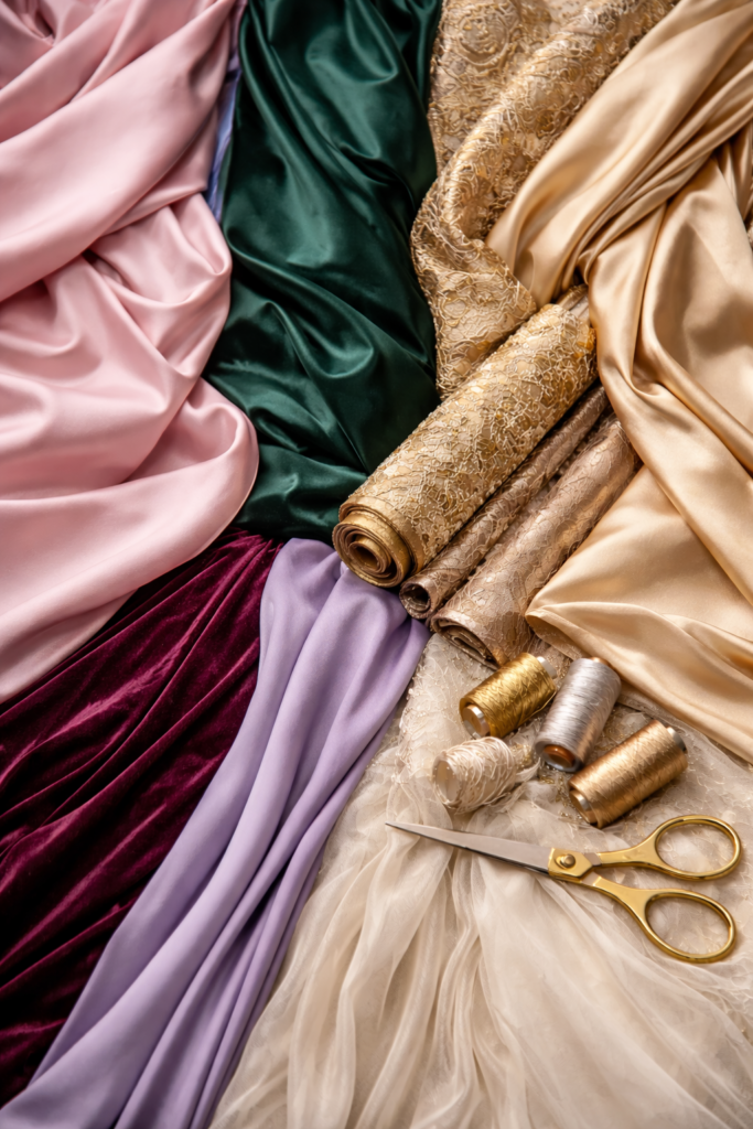 - Des tissus nobles (soie, satin, velours)